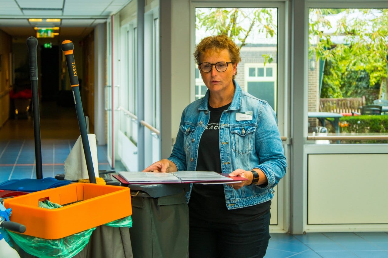 “Samen met mijn collega’s verzorgen wij de dagelijkse schoonmaak van alle ruimtes in ons huis. Denk aan de afdeling, vergaderruimte, openbare ruimte, het Grand Café, de kantoren en toiletten. Ook verzorgen wij de was van de bewoners. Daarnaast zorg ik ervoor dat alle middelen en materialen altijd netjes zijn en op hun plek staan.”