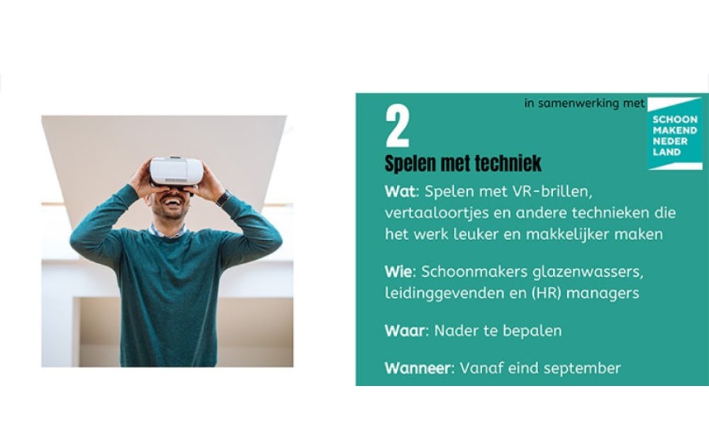 Schoonmakend Nederland faciliteert twee leergemeenschappen: Spelen met techniek en Arbeidsmobiliteit. Voor het onderdeel Spelen met techniek zoekt Schoonmakend Nederland (medewerkers van) mkb-ondernemers die willen zien én ervaren welke technieken er zijn die het werk én de werknemers ondersteunen. Denk bijvoorbeeld aan vertaaloortjes waarmee anderstaligen toch met elkaar kunnen communiceren, een robot of een cobot, en andere technieken.
