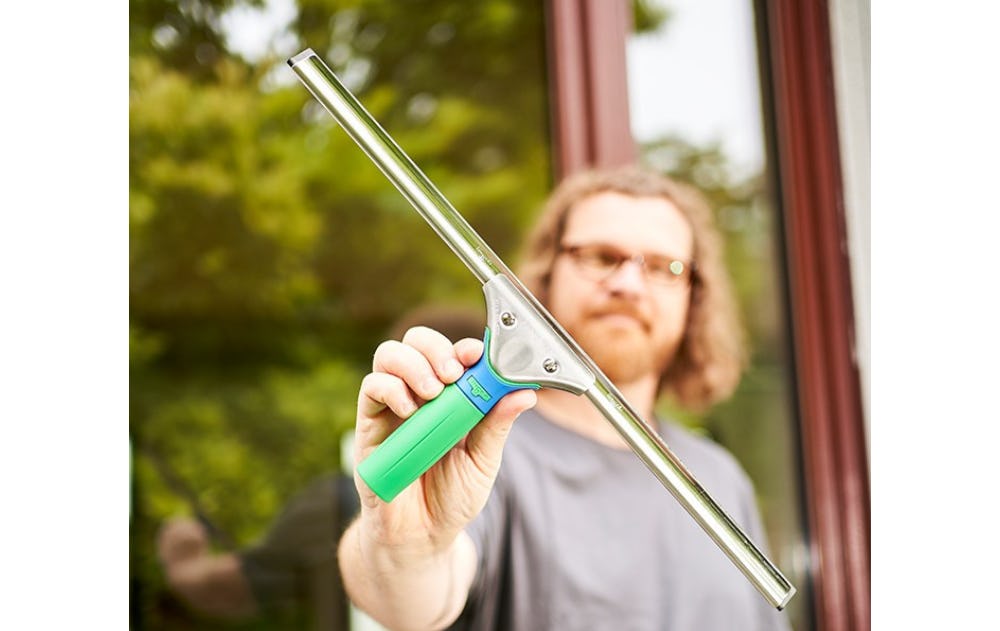 De Green Label raamwisser is 's werelds eerste gereedschap voor het klassiek reinigen van glas dat duurzaam gecertificeerd is. Het ergonomische handvat bestaat uit twee componenten en is uitgerust met een S-rail van robuust roestvrij staal en de geoptimaliseerde S-veer - voor het eenvoudig verwisselen van wisserrubber en rail. De groene Label raamwisser is voorzien van het FSC-gecertificeerde Green Label wisserrubber. In combinatie met een telescoopstang sluit de nieuwe raamwisser stevig aan op de ErgoTec veiligheidskegel, zodat er geen verdraaiing of val is.