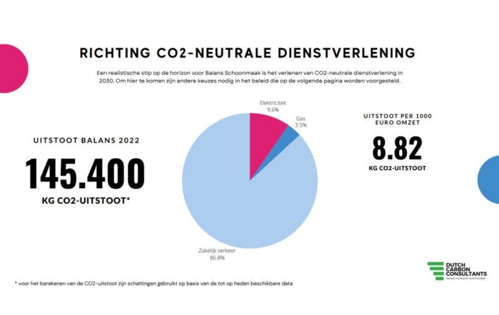 Balans Schoonmaak werkt hard aan het verkleinen van de CO2-uitstoot. “Ons doel is om in 2026 de CO2-uitstoot voor het zakelijk verkeer (scope 1) met 30 procent te verminderen door het gebruik van HVO-diesel en elektrificatie van ons wagenpark. Voor de CO2-uitstoot door elektriciteit (scope 2) streven we naar een reductie van 80 procent, waarbij we ons focussen op groene stroom.” Daarnaast is het streven om zakelijk reizen te reduceren met 5 procent door het stimuleren van duurzaam gedrag en het beperken van woon-werk kilometer.