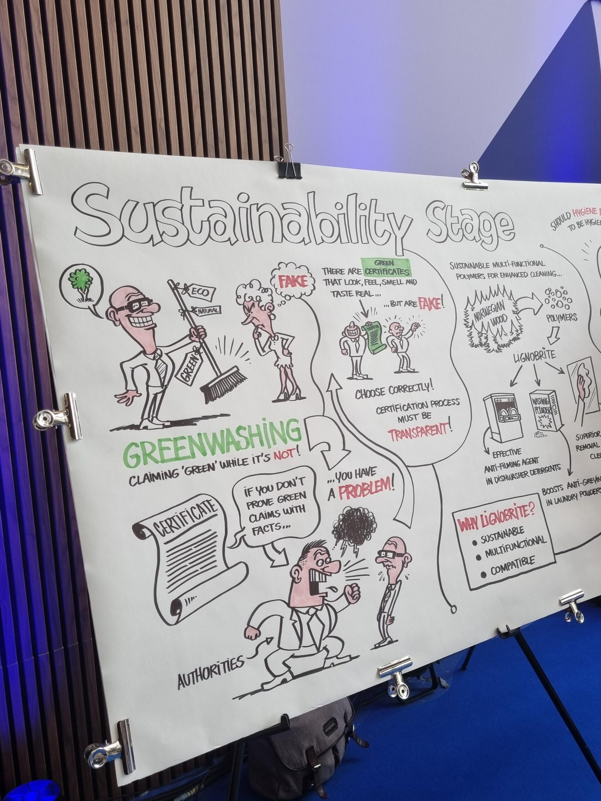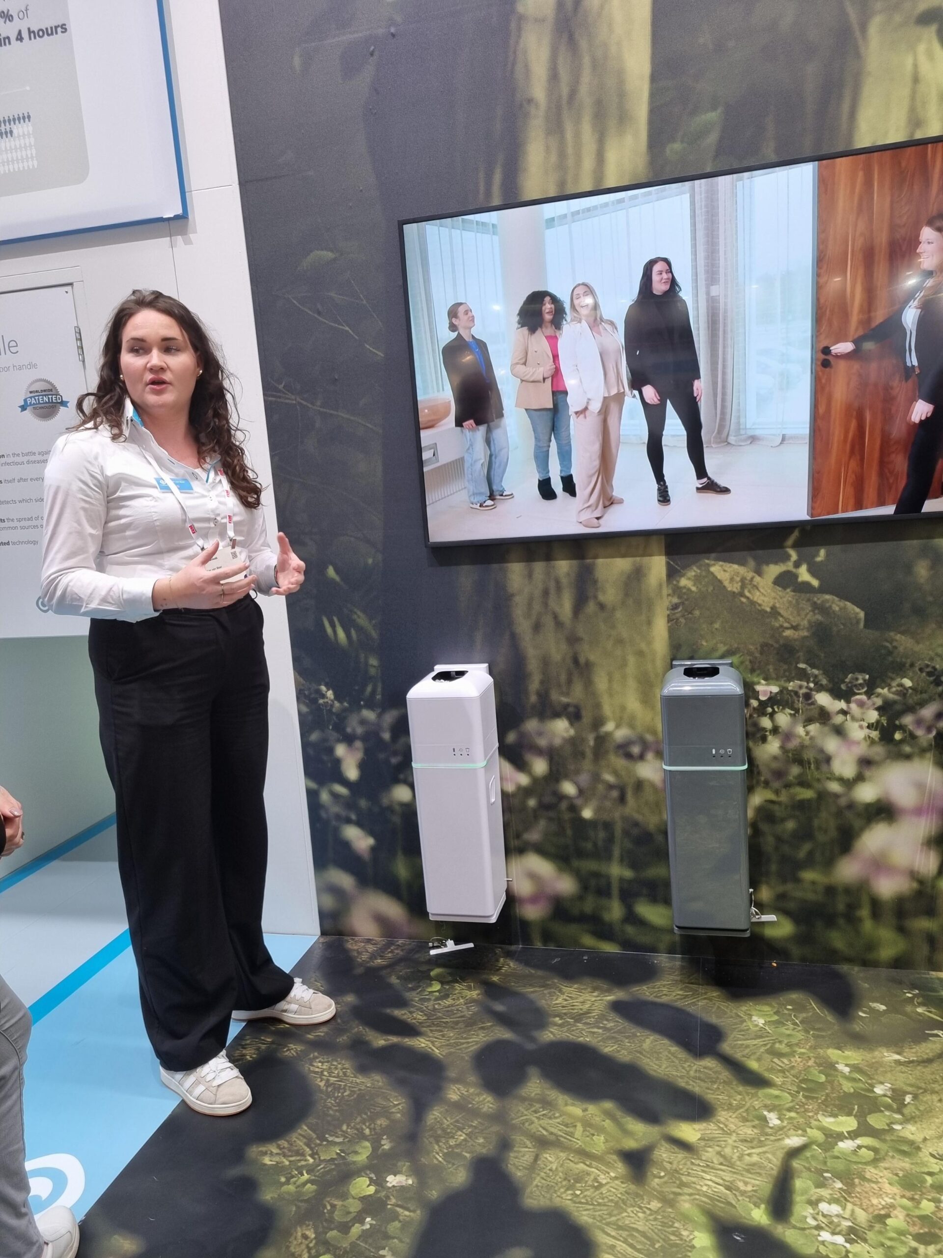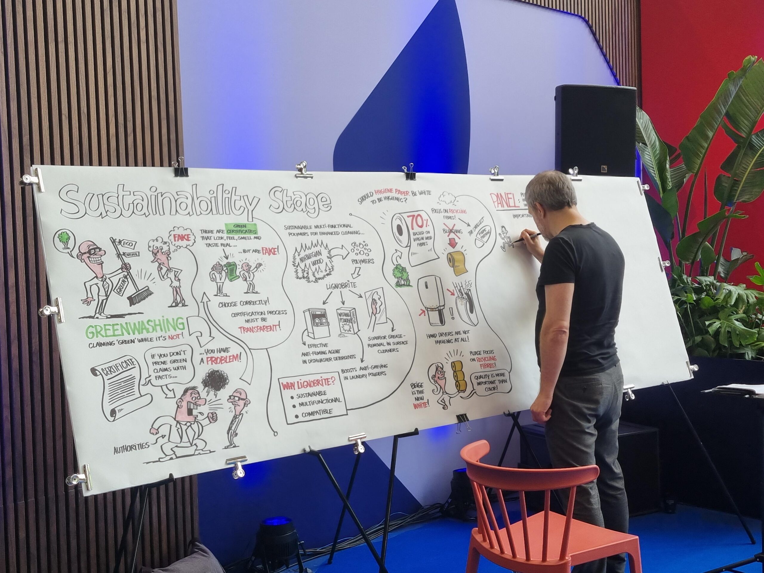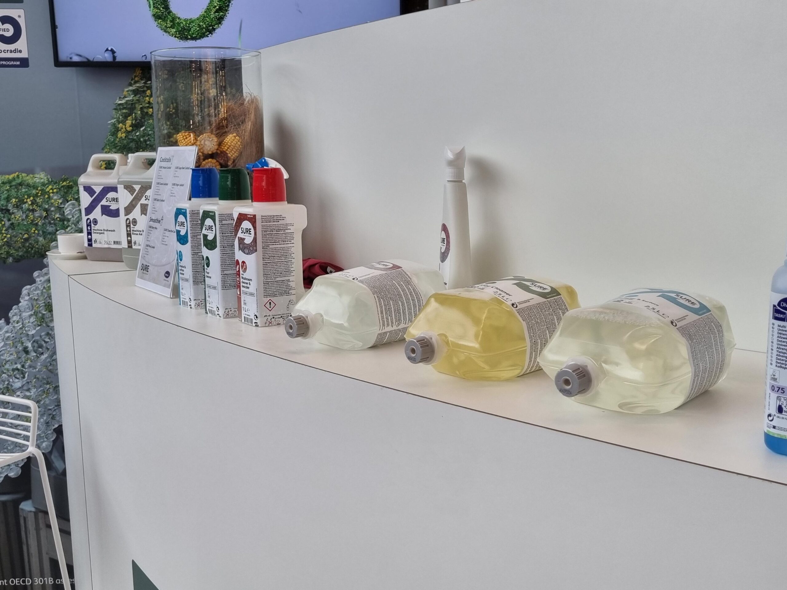 Bij Diversey is het assortiment op de stand even divers als de naam doet vermoeden. Zo heeft de producent van schoonmaakoplossingen verschillende ranges schoonmaakmiddelen meegebracht. Waaronder de Sure range, de meest duurzame tot nu toe met een EU Ecolabel en Cradle to Cradle-certificering. Lynne Snoding legt uit dat er voor ieder bedrijf wat wils is: plantaardige middelen, in grote en kleine verpakkingen, minder transport door geconcentreerde middelen. In de Sure range komt alles samen. Daarna showt ze de nieuwste werkwagen, van ruim zestig procent gerecycled plastic en de Lesseau-zeepdispenser, met wie ze een samenwerking hebben. Lesseau won eerder deze week al de Amsterdam innovation award.