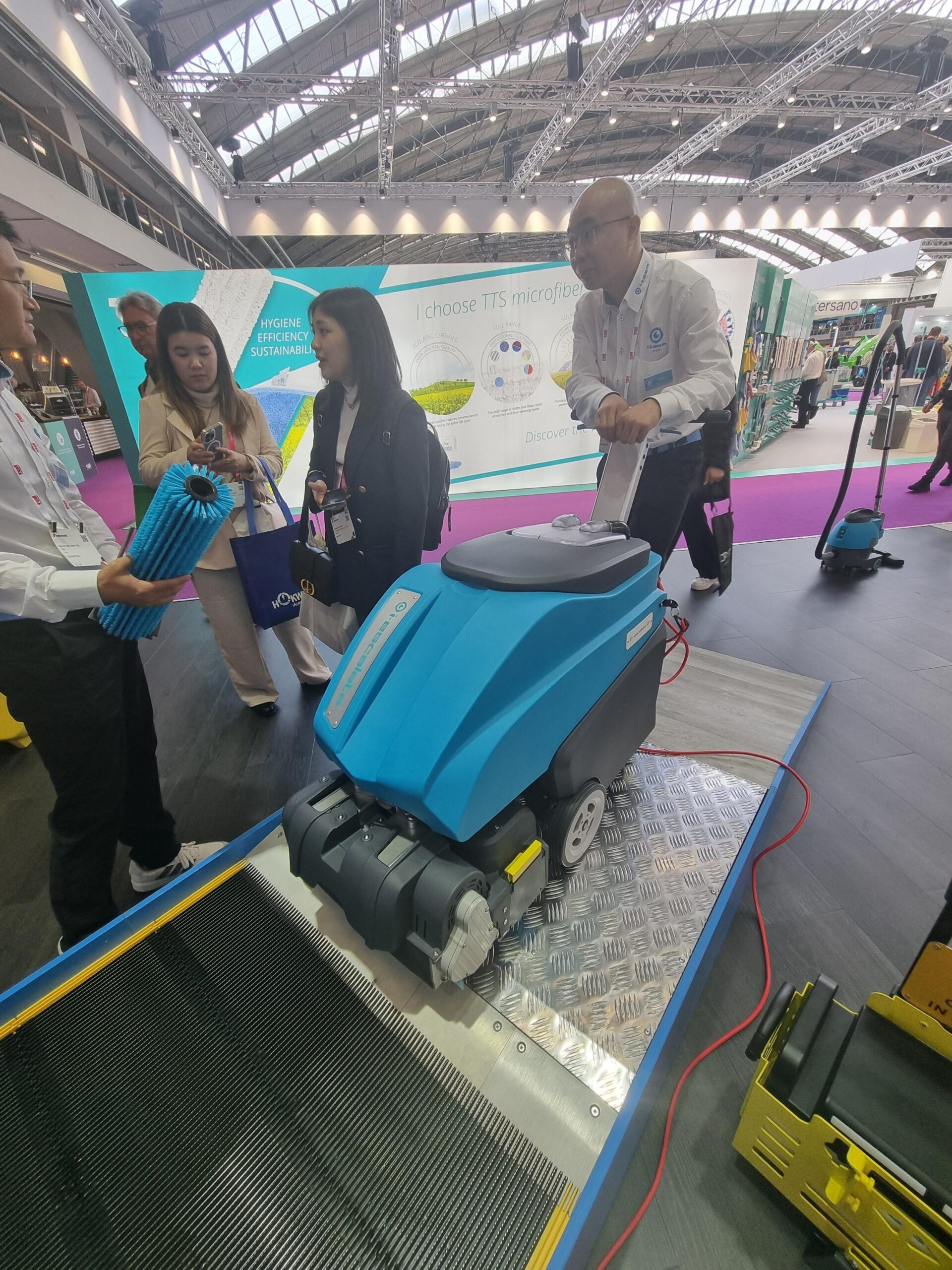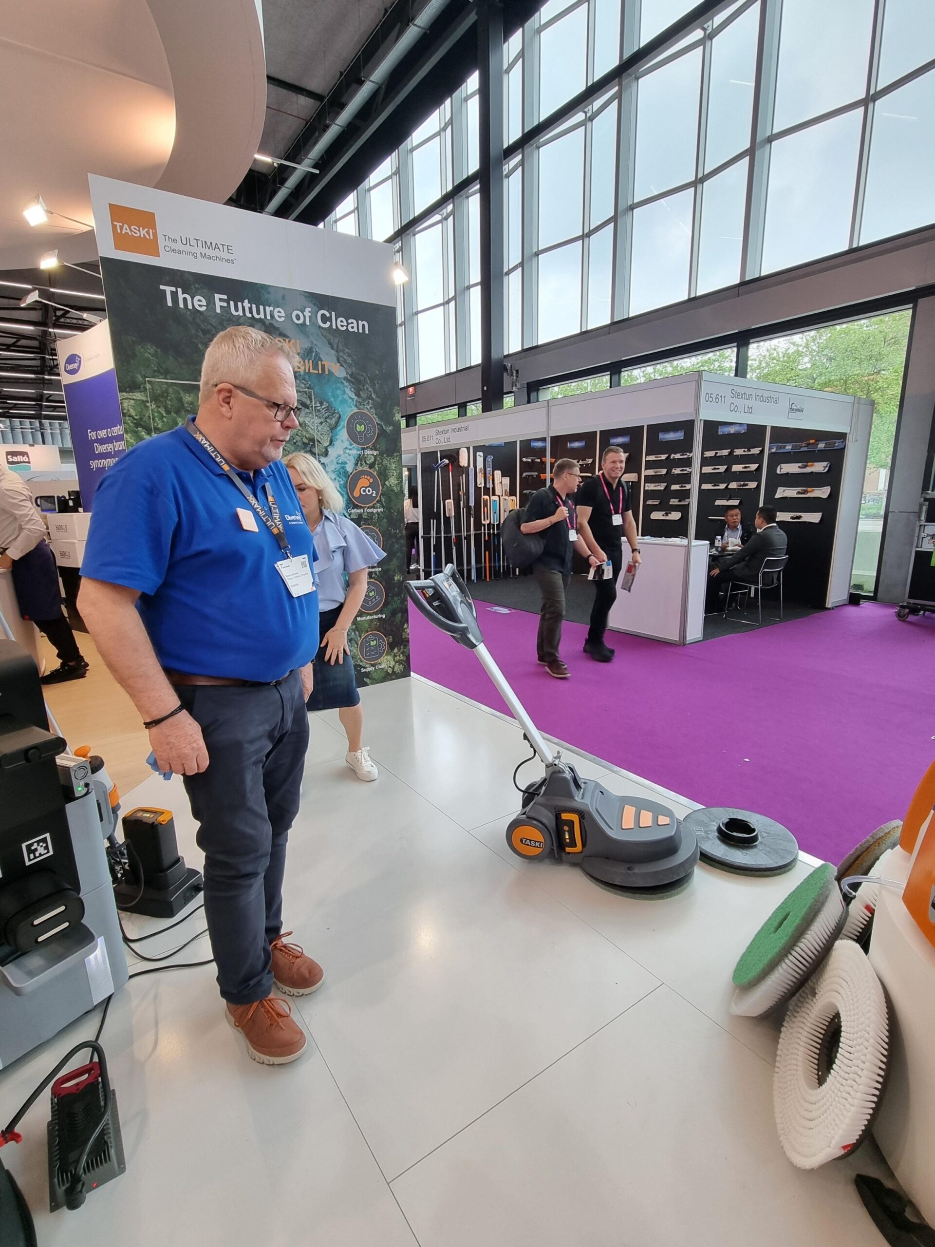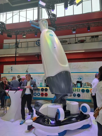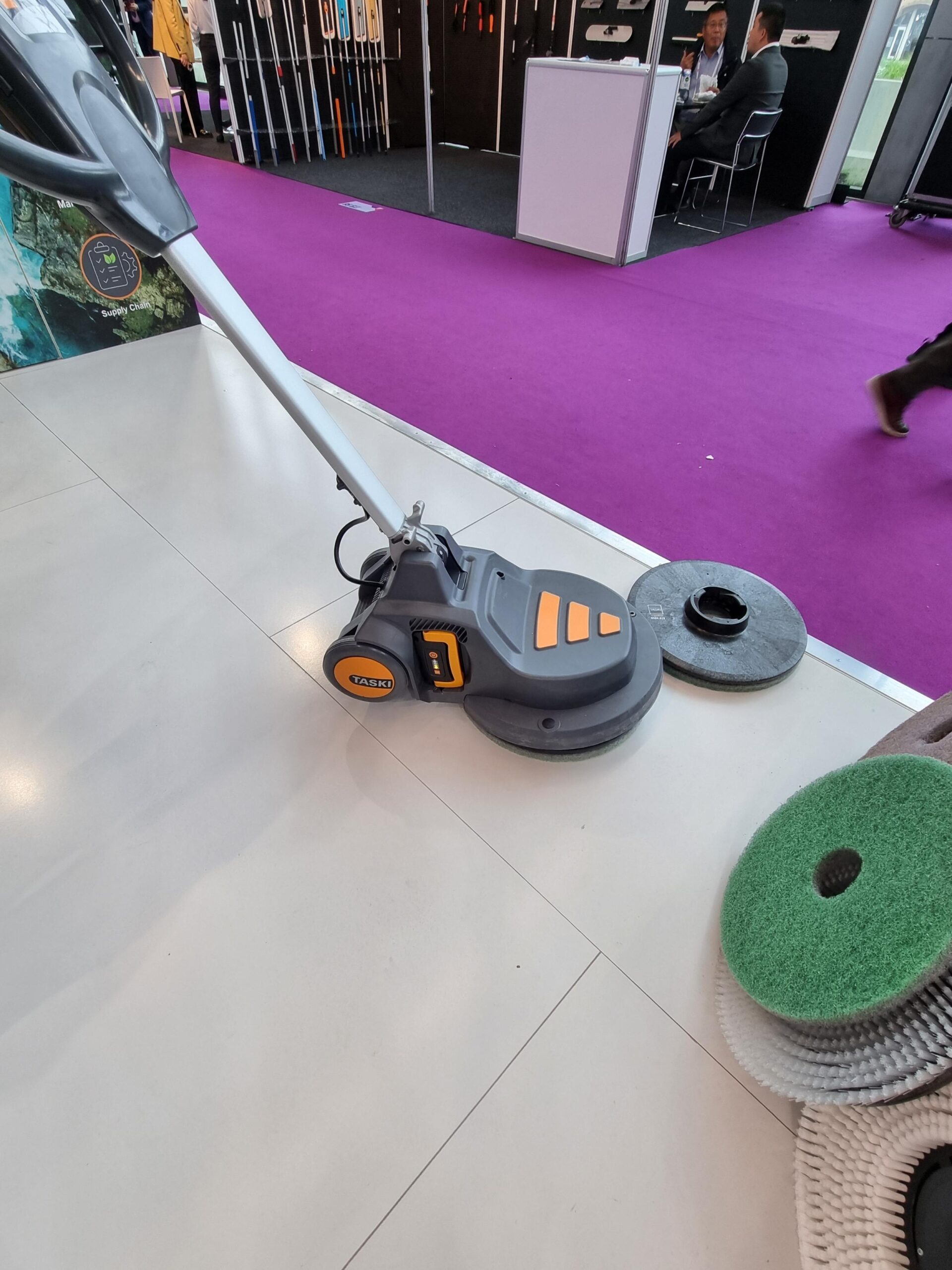 Aan de andere kant van de stand staat Diverseys merk Taski met een hele productlijn schoonmaakmachines. Van een kleine stofzuiger tot een volledig autonome schrobzuigrobot. In de nieuwste lijn Ultimaxx zie je op een display wat je aan het doen bent en kun je alles instellen naar wens. Alle machines zijn veelzijdig doordat je er veel verschillende schijven onder kunt zetten. Van klein naar groot naar groter. Aan de andere kant staat een van de schrobzuigrobots van Taski. Hij heeft een watertank met filters, zodat het water driemaal gebruikt kan worden. Daarna gaat hij zelf naar zijn dockingstation om het vuile water weg te doen. Ten slotte is er nog de nieuwe eenschijfsmachine, waarmee je vloeren kunt schrobben en polijsten zonder snoer. Het is de enige draadloze eenschijfsmachine die op het moment te koop is en je kunt schrobben naar alle lust: als de accu leeg is, heeft hij een tweede die je erin kunt klikken, terwijl de eerste weer oplaadt.