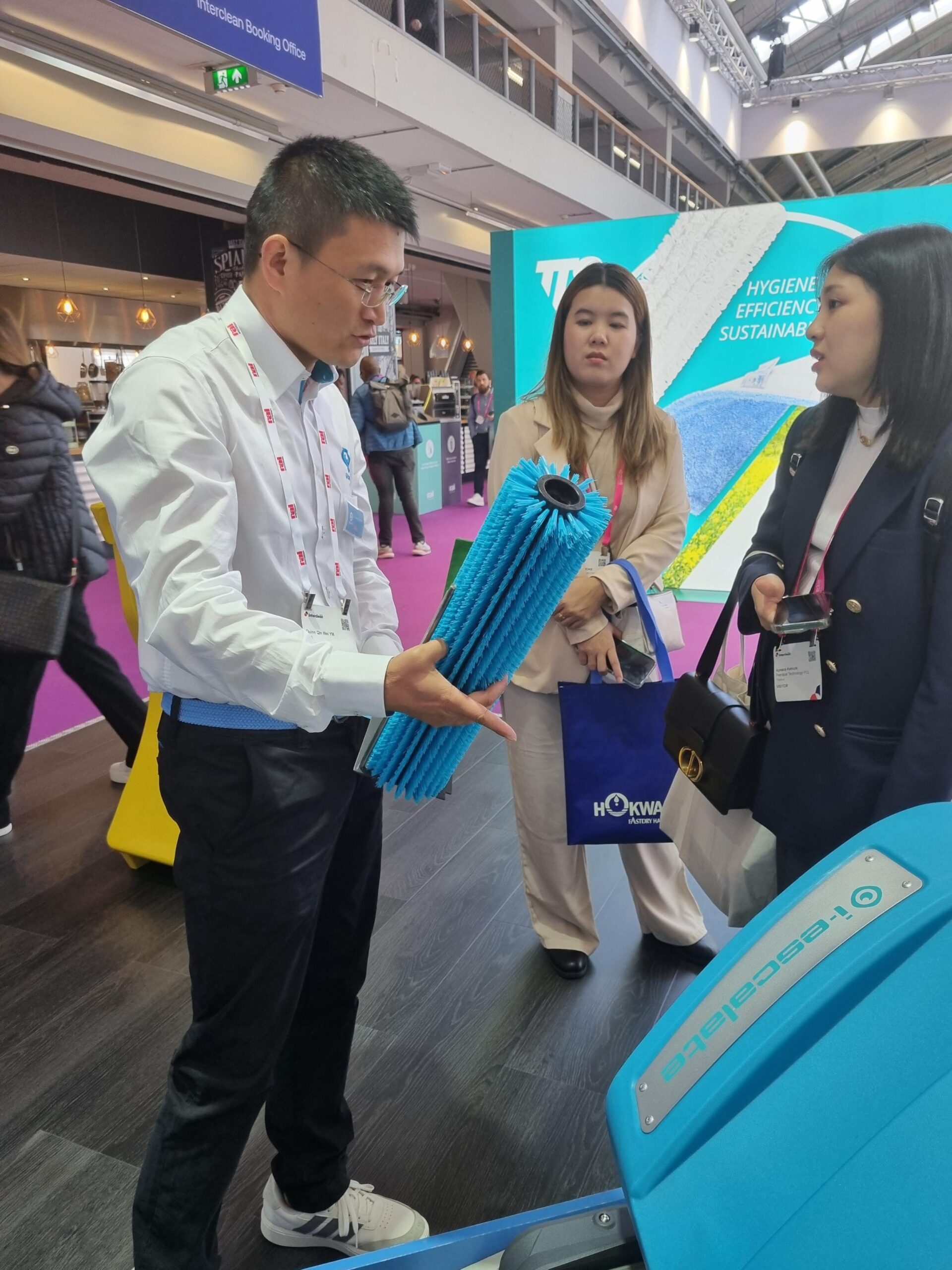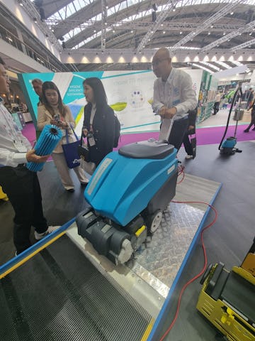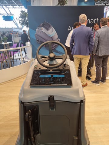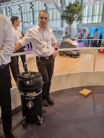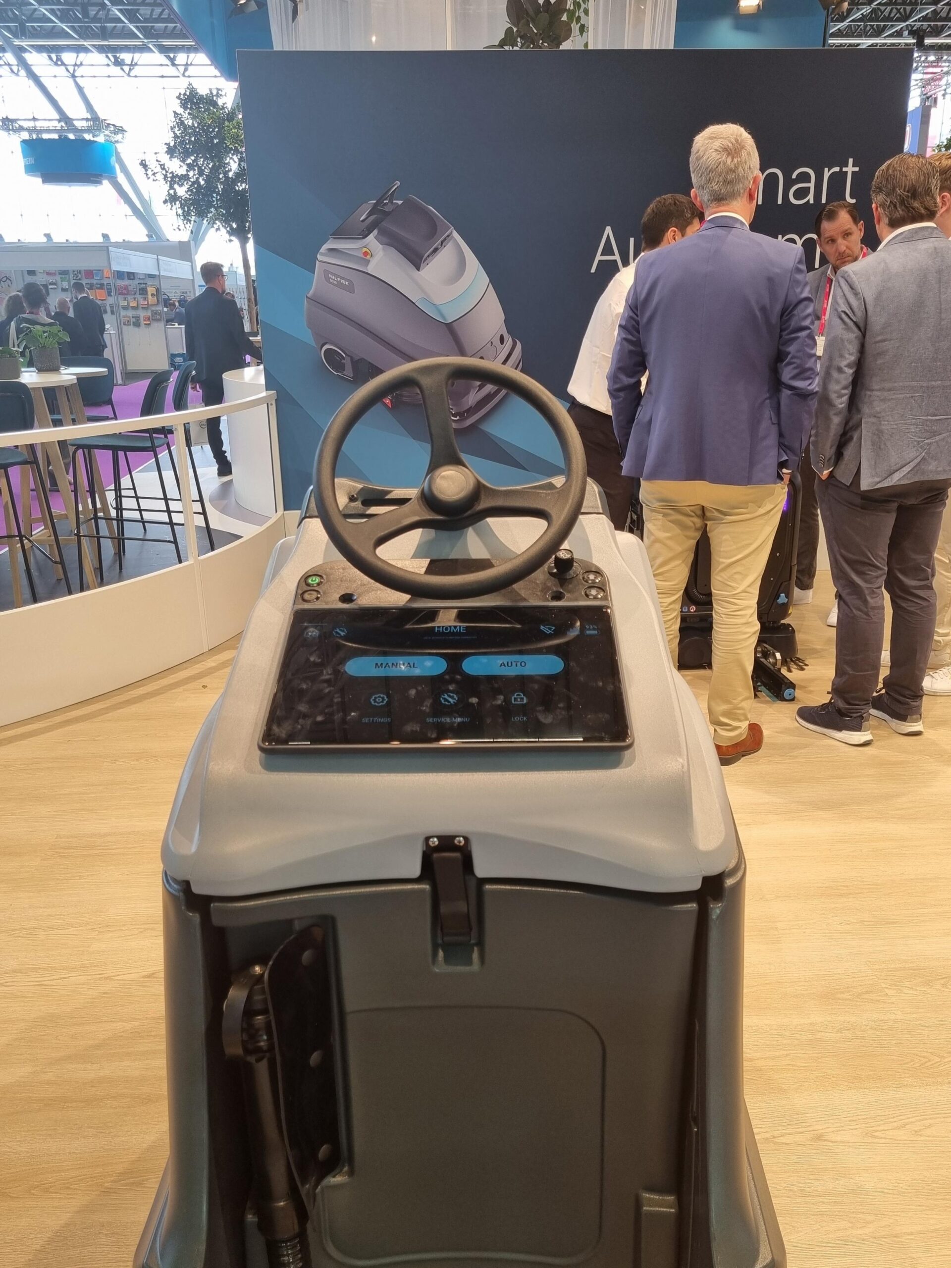 Bij Nilfisk vond je aan elke kant van de stand weer andere apparaten. Zowel oude bekende, maar verbeterde machines, als gloednieuwe robots die deze Interclean zijn geïntroduceerd. Zo heeft Nilfisk in samenwerking met Lionsbot de SC25 ontwikkeld. Het compacte, modern uitziende apparaat is de ideale autonome schrobzuigrobot die je eigenlijk overal kunt toepassen. Hij gaat uit zichzelf naar zijn dockingstation om op te laden en water te verversen en kan na het 'inleren' van zijn ronde deze zelf op elk gewenst tijdstip uitvoeren. Harshith Nambula vertelt dat ze bij Nilfisk altijd eerst uitgaan van veiligheid. De tweede prioriteit is kwalitatieve schoonmaak. Dat betekent niet dat hij niet goed schoonmaakt. Integendeel, het betekent dat de robot overal veilig ingezet kan worden. Met sensoren en camera’s rondom weet hij precies wat er om zich heen gebeurt en kan hij daarop anticiperen.