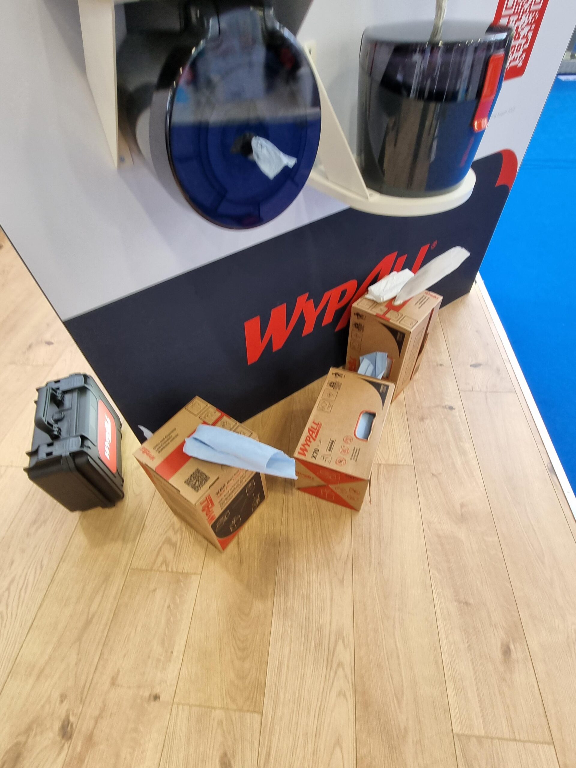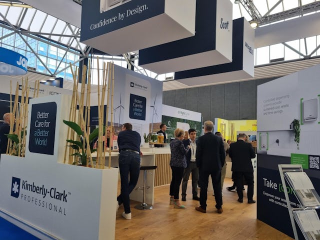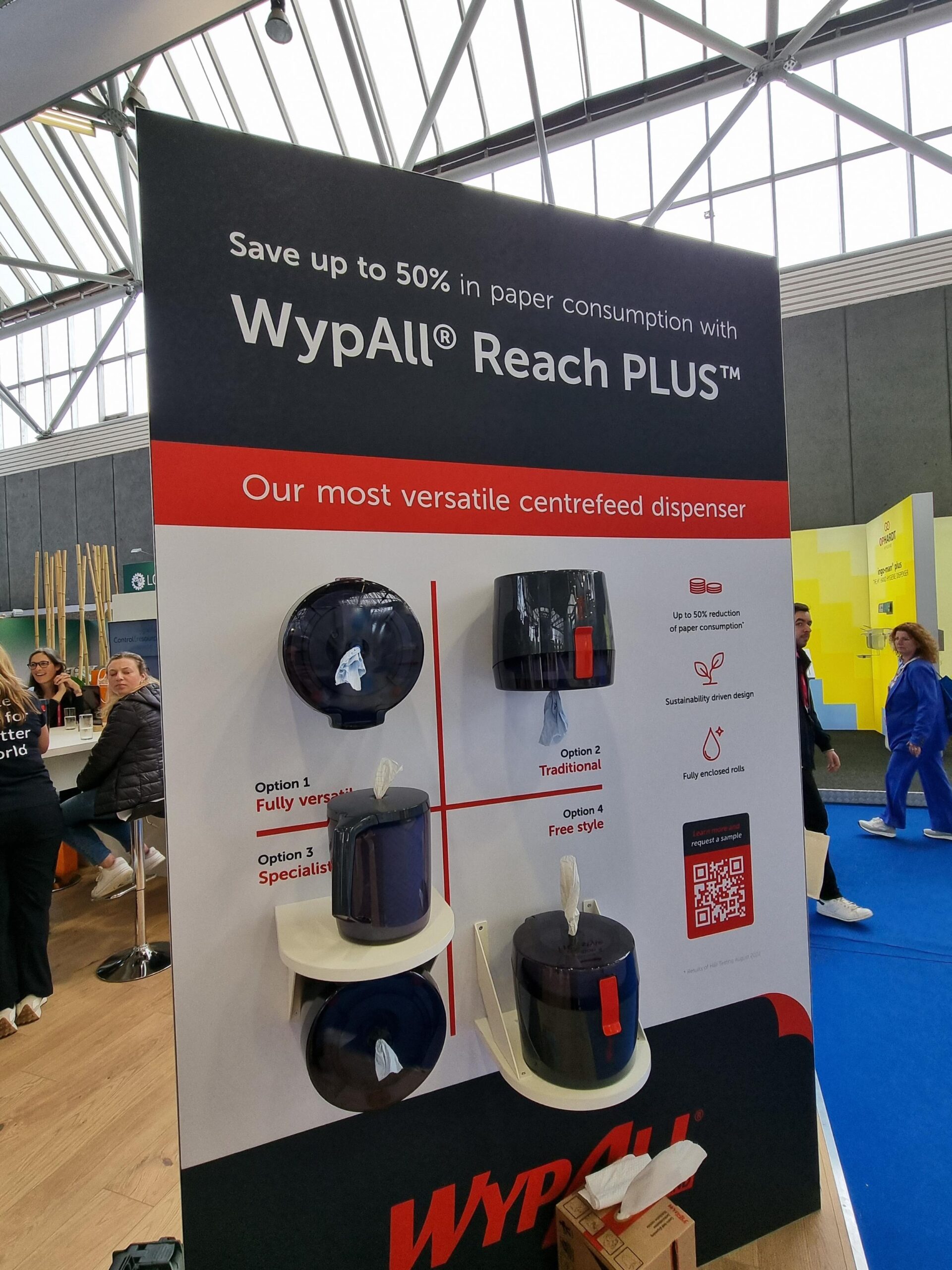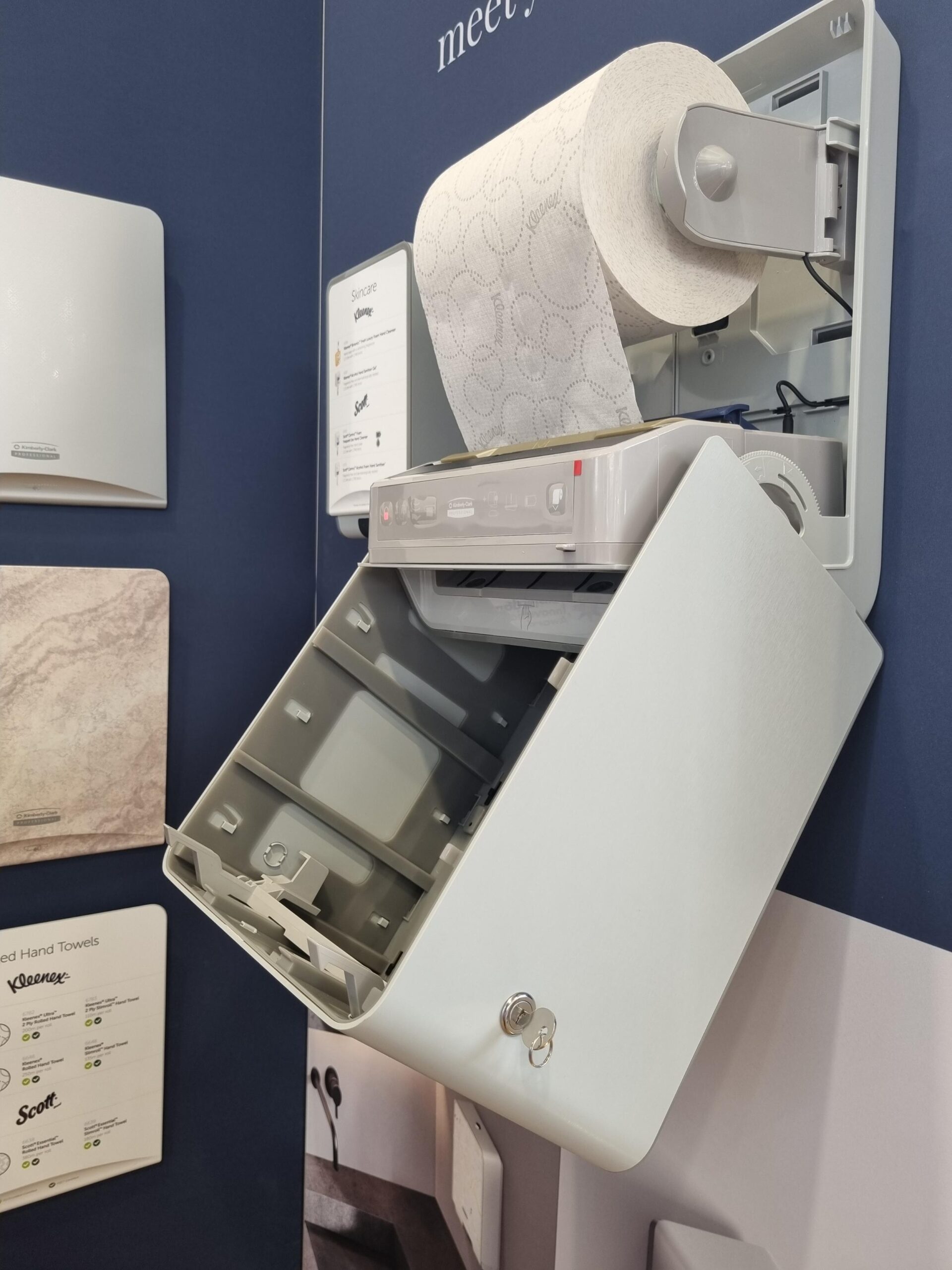 Bij Kimberly-Clark vergenoegden we ons aan de dispensers met de Wipersrange van WypAll en de Iconrange. De WypAll-dispenser voorziet de gebruiker gemakkelijk in doekjes en hij is veelzijdig. Je kunt hem neerzetten of in elke mogelijke oriëntatie ophangen. Er komt een doekje per keer uit, zodat je niet meer pakt dan je nodig hebt. Ook brachten ze een kartonnen dispenser mee die je op twee manieren kunt gebruiken. Deze is waterdicht. De Icon Range is volgens Kimberly-Clark de nieuwe standaard in washroom dispensers. Wat is er zo mooi aan? Je kunt de lengte van het papier en hoe hij hangt zelf instellen, de papierrol is maar liefst 380 meter lang (de langste die er is) en hij is in verschillende diktes te verkrijgen. Ook geeft hij aan wanneer hij bijgevuld mag worden en wanneer je hem moet opladen. Tenslotte kun je het frontje aanpassen naar smaak. Niet alleen leuk, maar ook heel handig. Zo kun je ook een frontje plaatsen dat het bewustzijn vergroot van de duurzaamheidsuitdagingen in washrooms.