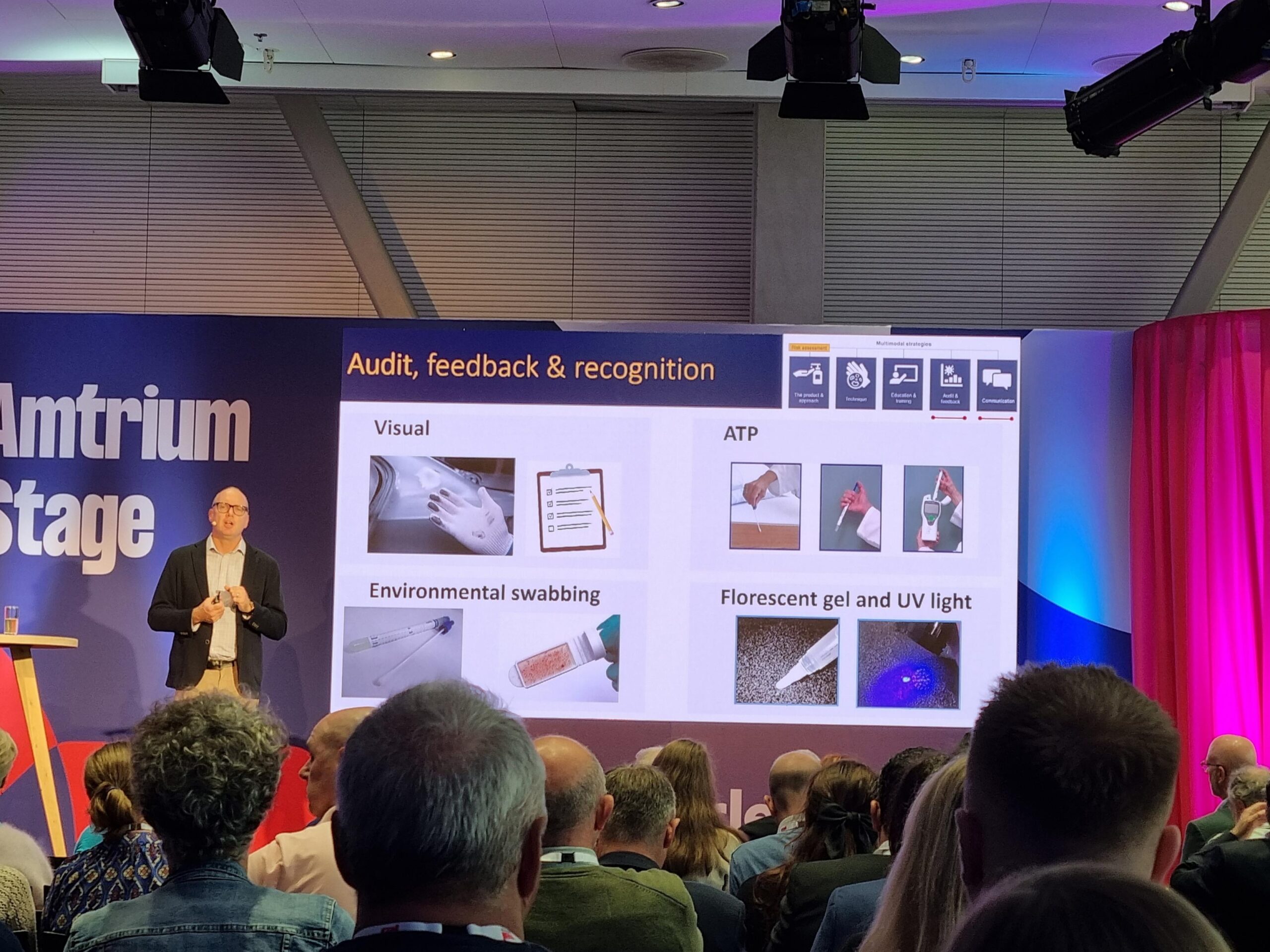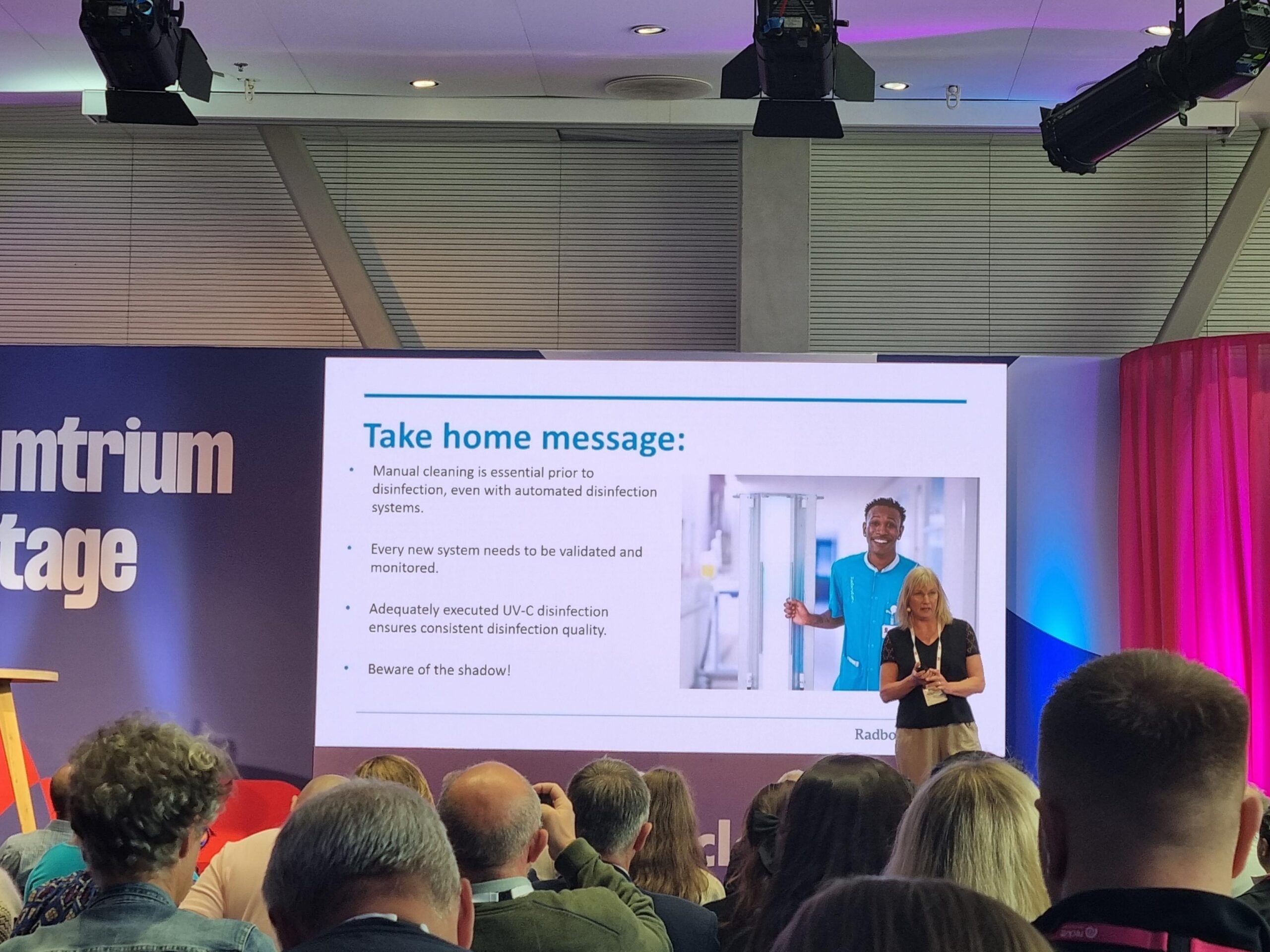 We begonnen met een bezoekje aan het Healthcare Cleaning Forum. Hier konden de bezoekers de hele dag inspiratie opdoen over elk facet van schoonmaak in zorgomgevingen. Zo sprak klinisch microbioloog Edmée Bowles bijvoorbeeld over het waarom, wat en hoe van geautomatiseerde kamerdesinfectie. “Microben kunnen heel lang overleven in een ziekenhuisomgeving. Tot wel twee jaar. Dus stel je voor dat een ziekenhuiskamer nooit wordt gedesinfecteerd.” Conventioneel wordt schoonmaak en desinfectie met de hand gedaan en dat kost veel tijd en energie. Ook kan de kwaliteit van de schoonmaak door de dag heen variëren. Daar kan geautomatiseerde desinfectie het antwoord op zijn. “Dat kun je bijvoorbeeld doen met waterstofperoxide. De peroxide doodt de bacteriën en daarvoor zijn twee methoden: een aerosol en een mist.” Een tweede methode is UV-C: “Deze straling breekt DNA en RNA af.”