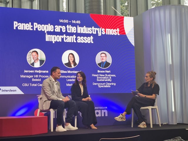Er is een keur aan robots en cobots te zien op de Interclean, maar er is ook aandacht voor het belangrijkste element in de schoonmaak: de mens. In een paneldiscussie op het sustainability stage gingen Jeroen Heijmans van CSU en Elisa Montanari van Markas erover in gesprek. De eerste vraag: wat zijn op dit moment de grootste uitdagingen? “Het gebrek aan mensen”, was Montanari’s directe antwoord. Heijmans onderschreef dit. Ook in Nederland is het moeilijk mensen te krijgen en te behouden. Diversiteit en inclusie zijn belangrijk bij dit laatste punt. Heijmans: “We hebben meer dan honderddertig nationaliteiten in ons bedrijf en het bedrijf van de toekomst is het bedrijf dat hiermee kan omgaan.” Montanari: “Het is erg belangrijk om de behoefte van de medewerkers te kennen en bijvoorbeeld trainingen aan te bieden die daarop aansluiten.” Ze noemde bijvoorbeeld dat ze een training hebben gemaakt met pictogrammen en kleuren zodat ook mensen die geen Italiaans kunnen het kunnen volgen.