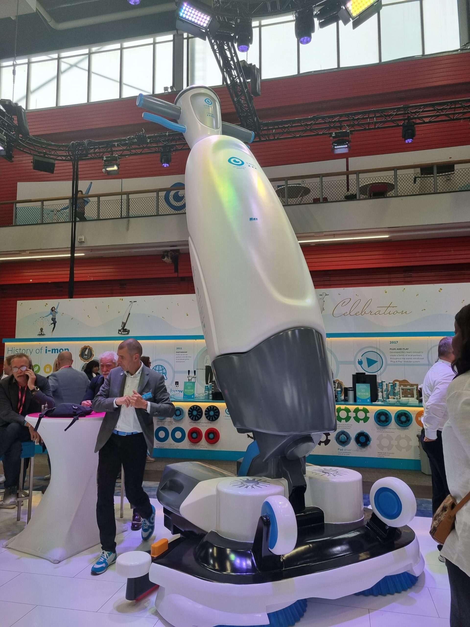 Aan de andere kant van de stand liepen we niet alleen tegen de Co-botic 45 en de gepatenteerde zelf-desinfecterende deurgreep i-clean handle aan. Hier stond ook de gloednieuwe i-escalate. Deze schobzuigmachine is een heel speciale: hij maakt namelijk roltrappen schoon. Met een cilindrische borstel schrobt de machine in een aantal minuten de treden van een roltrap schoon.