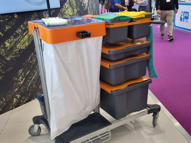 Misschien een wat minder sexy stand, maar zeker niet minder: Rubbermaid. Ian Sayers en Chris Davis leggen uit dat Rubbermaid doet waar ze al jaren goed in is: afvalbakken en hospitality. Want afval scheiden begint bij afval goed weggooien en dat begint dan weer bij goede bakken. De bakken van het merk Brute van Rubbermaid gaan zeker tien jaar mee en zijn er in alle soorten en maten. Ook maakt de fabrikant afvalbakken om in te scheiden met aandacht voor het gebruik ervan. Zo heeft de papierbak een langwerpige opening en die van de plasticbak een ronde. En dat maakt uit, zo betogen de mannen. Want je moet mensen helpen om goed afval te scheiden. Ze zetten dan ook niet hun bakken neer en gaan weer op weg, maar ze geven ook training en advies in afval scheiden. Daarnaast staan er oplossingen voor de hospitalitysector. Zeker de kleine ‘werkkar’, het is meer een vierkante koffer met vakken, scheelt hotelschoonmakers veel tijd en energie. Ze kunnen al hun middelen en materialen meenemen de kamer in, in plaats van de hele tijd op en neer te hoeven lopen naar de grote werkkar op de gang.