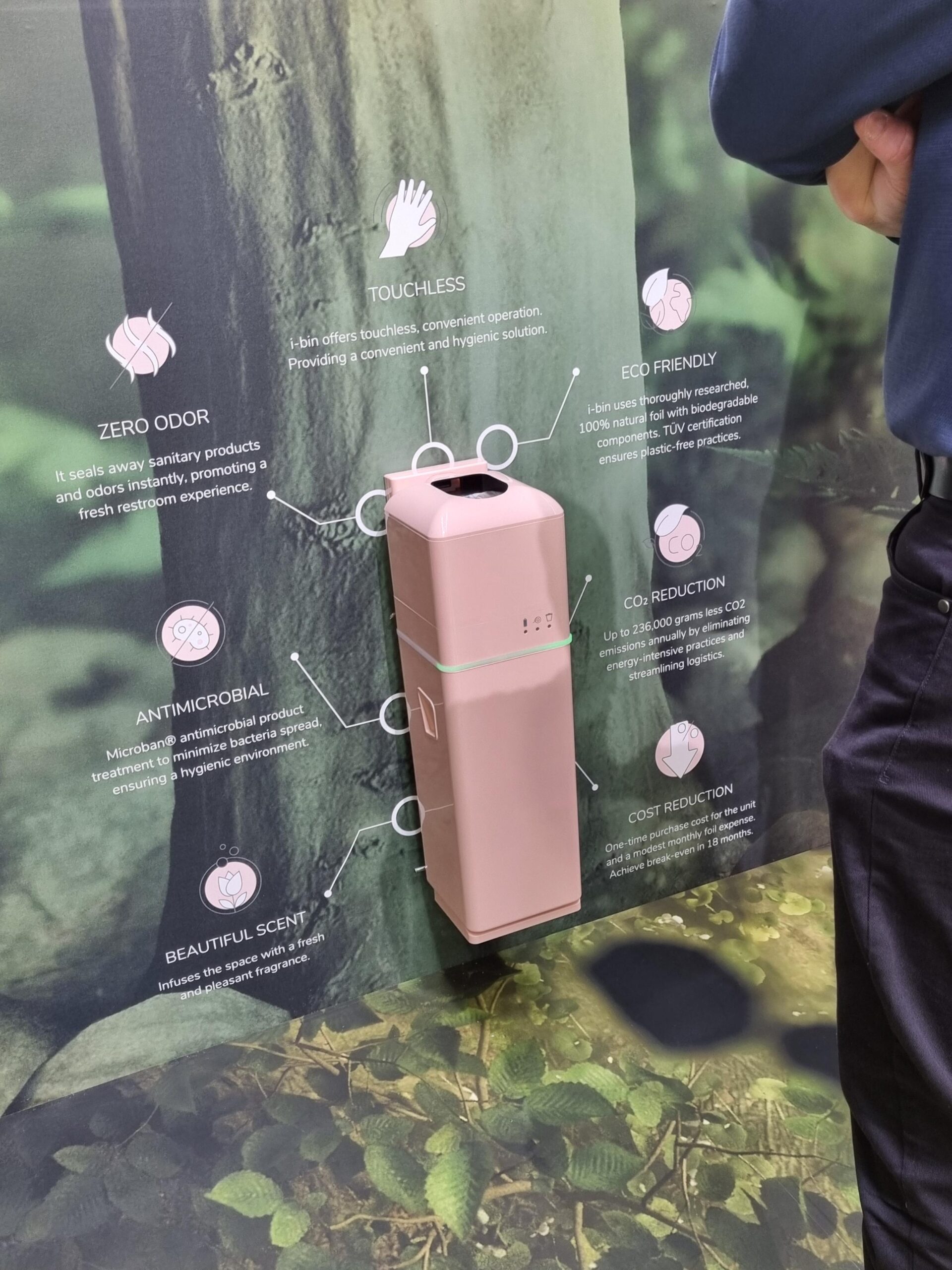 i-team besloot dit jaar niet met één stand naar de Interclean te komen, niet met twee, niet met drie, maar met maar liefst vier stands. Zowel binnen als buiten showde i-team de hele range aan producten. Daarbij was een van de stands volledig gewijd aan de welbekende i-mop, want die viert alweer zijn tiende verjaardag. Gefeliciteerd! Maar er waren ook genoeg innovaties te zien. Zo legde Kim van Baar uit hoe de i-bins een mooie, duurzame en hygiënische oplossing bieden voor in de toiletruimte. Wanneer iemand er iets ingooit, wordt dat in een apart zakje gestopt en afgesloten en vervolgens in de bak gedropt. Zo komen er geen nare geurtjes meer uit de afvalbak. Natuurlijk wil i-team geen hopen extra plastic het milieu inbrengen. Daarom zijn de zakjes biologisch vriendelijk gemaakt van onder andere mais. Van Baar steekt haar hand ook in de bak, die vervolgens met een piep aangeeft dat er nog iets voor de sensor hangt. Veilig dus. En dat in vier verschillende kleuren en volledig touchless.