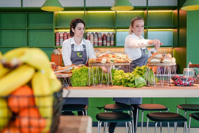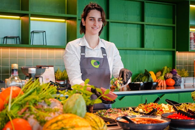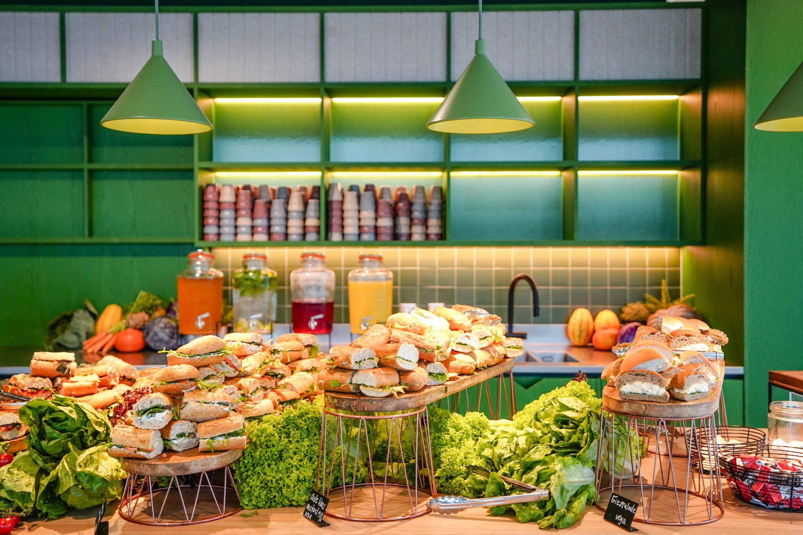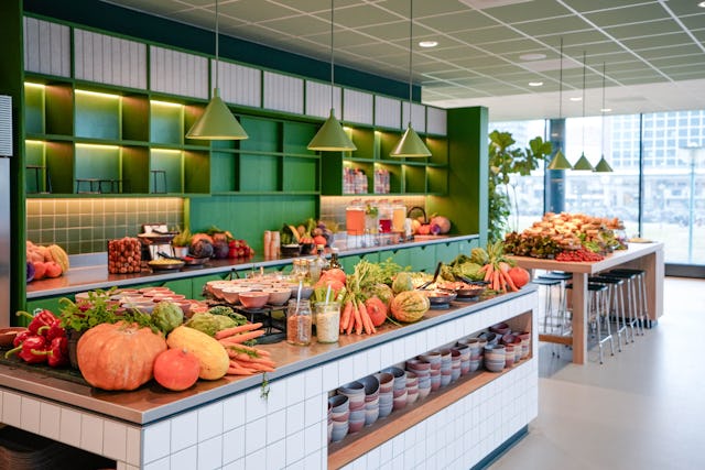 ‘Salades, maaltijden, soepen en broodjes: zo veel mogelijk wordt op locatie vers bereid’, voegt Shalane Kraijema eraan toe. Zij is als productmanager verantwoordelijk voor het assortiment. ‘In samenwerking met horecagroothandel InSTock gebruiken we veel seizoensgebonden en regionale producten. We sturen op minder gebruik van zout en suikers en maximaal behoud van voedingswaarden. Minimaal 70% van het aanbod is plantaardig.’