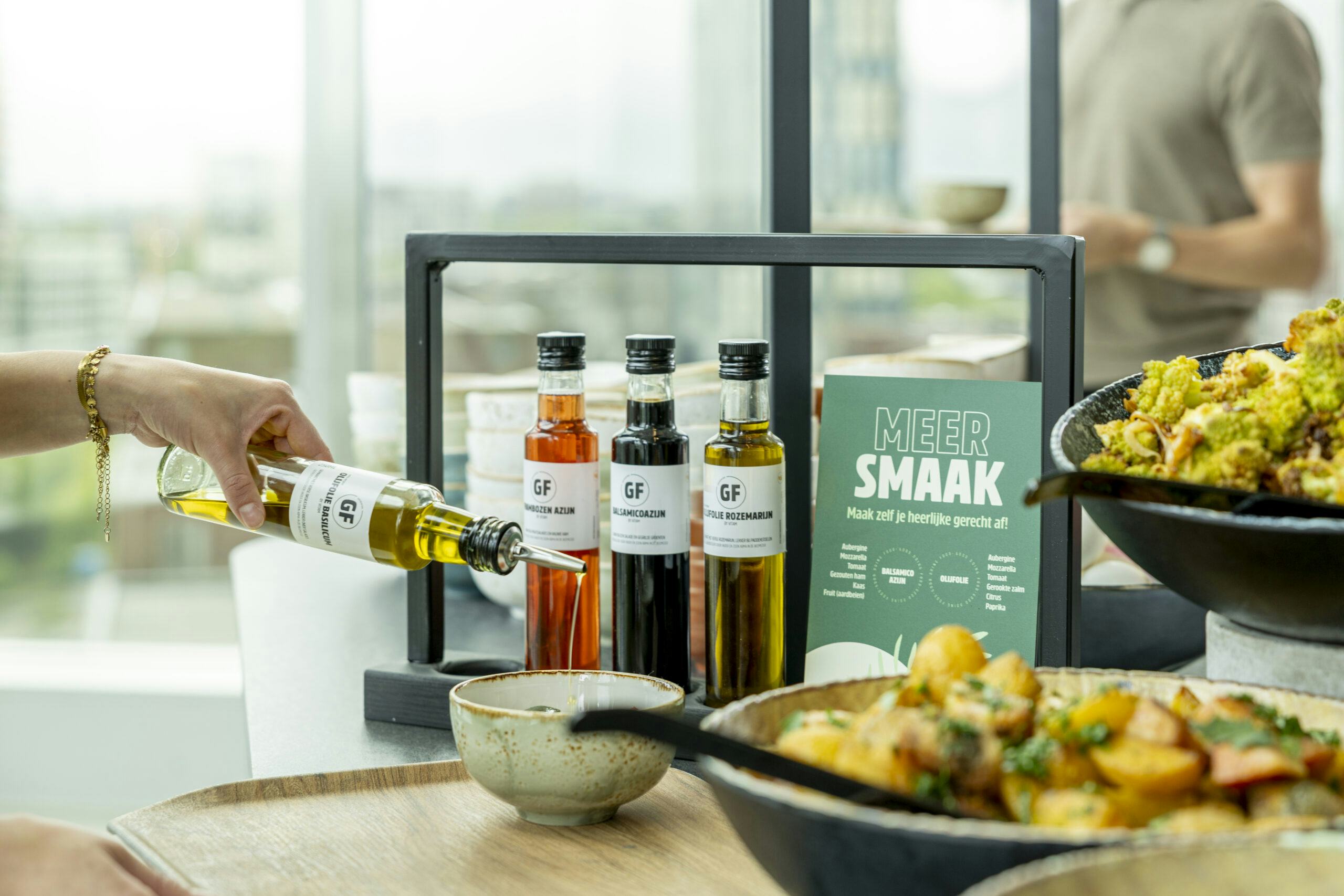 Daarbij doet presentatie veel, zo vervolgt ze. 'Onze salade-/groentebar is het middelpunt van het buffet. Het aanbod is heel aantrekkelijk en daarmee verleiden we mensen tot gezondere en duurzamere keuzes. De basis is dat het eten en drinken echt lekker is. We zeggen er niet expliciet bij of iets plantaardig is. We maken wel plantaardige keuzes in de bereiding, bijvoorbeeld door plantaardige kookroom te gebruiken in gerechten; dat merkt een gast niet en het is toch weer een stap.'