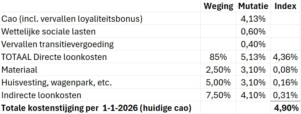 Stel dat de nieuwe cao voorschrijft dat de lonen per 1 juli 2026 met nog eens 2,5 procent stijgen, dan zou er in januari een indexering berekend moeten worden van ruim 7 procent. Uitgegaan van 4,9 procent kostenstijging per 1 januari en een extra loonstijging van 2,5 procent die voor 85 procent (aandeel loonkosten) cumulatief is meegerekend.