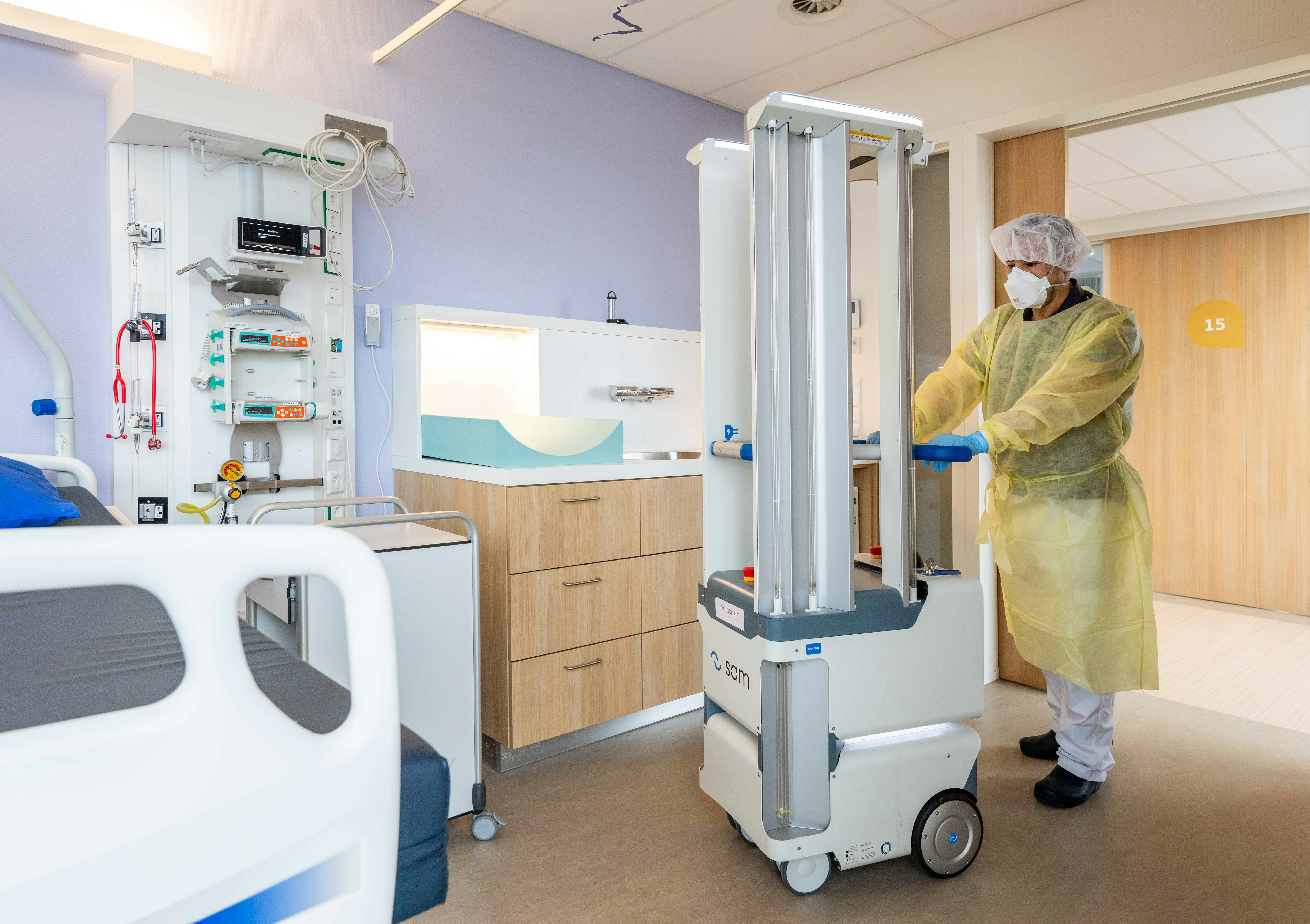 In het ziekenhuis worden niet alleen stofzuig- en schrobrobots ingezet. Er is ook een desinfectierobot voor isolatiekamers, Sam genaamd. Schoonmaakmedewerker Hakim Achahbar beschrijft het proces. ‘We maken de kamer eerst zelf schoon. Wanneer we daarmee klaar zijn, dan zetten we de desinfectierobot daar neer. Met een tablet instaleren we hem, zodat ‘ie met speciaal UVC-licht de kamer infectievrij kan maken.’ Koenraadt vat het beeldend samen: ‘Het is eigenlijk een soort rijdende zonnebank, die met UVC-licht bacteriën doodt.’