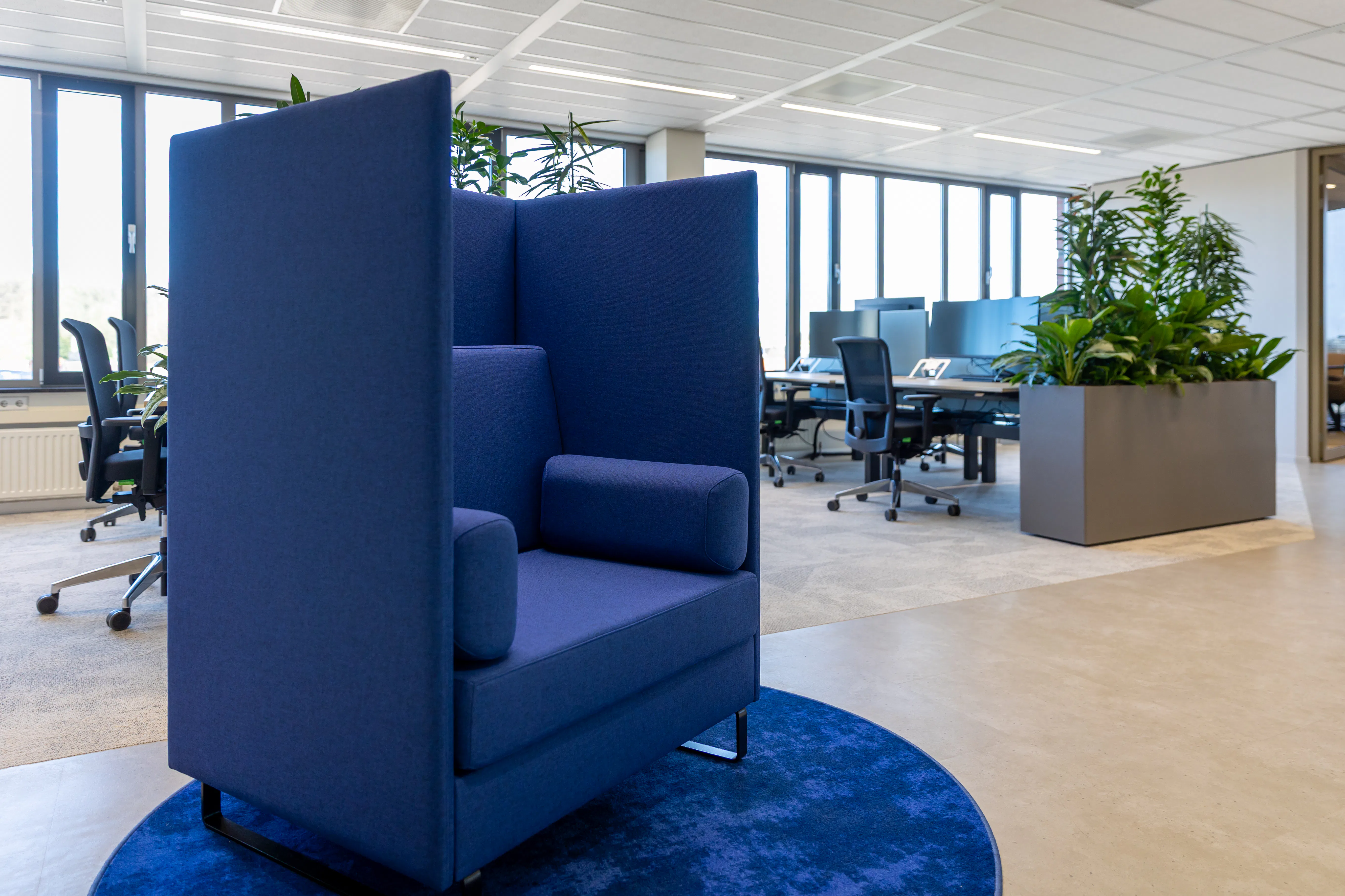 Bij de herinrichting werd gekozen voor een werkplekconcept gebaseerd op vier typen activiteiten: Connect, Conference, Concentrate en CoWork. Geen blauwdruk, maar een manier om verschillende behoeften te structureren. Leenders: ‘Je ziet dat mensen naar kantoor komen om samen te werken, te leren of elkaar te ontmoeten. Daar moet je omgeving op ingericht zijn. Niet andersom.’