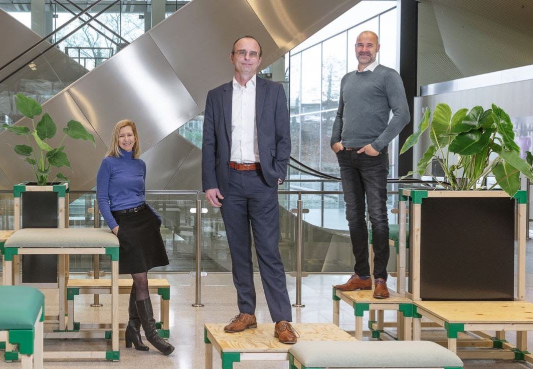De begane grond van het PGGM-gebouw in Zeist wordt omgevormd tot een plek om te ontmoeten, ontspannen en samen te werken. PGGM Plaza biedt medewerkers en bezoekers een nieuwe experience, duurzaam gerealiseerd door hergebruik van bestaand meubilair en materialen. Een gesprek met Arnold Veenema, Mirjam Dekker en Maarten Vink over de achtergronden en uitvoering van de herinrichting.