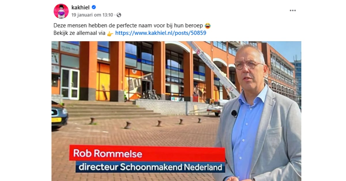 Sommige mensen hebben een naam die perfect bij hun beroep past. Bijvoorbeeld een dijkinspecteur die Van Dijck heet, of een notaris met Van der Geld als achternaam. Dat geldt natuurlijk ook voor Rob Rommelse, directeur van branchevereniging Schoonmakend Nederland. De combinatie van achternaam en beroep leverde hem een vermelding bij internetfenomeen Kakhiel op.